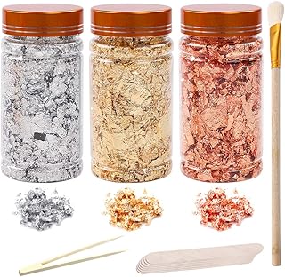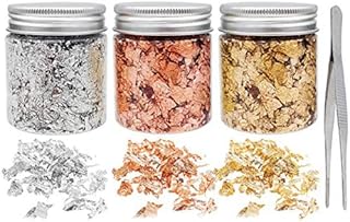 3 Packs Imitation Gold Flocken, 15g Blattmetall Gold Blattgold Flakes Gold Blatt und Silber Blatt für Kunst, Vergoldung Handwerk, Harzkunst Kunsthandwerk Nagelkunst Möbel Dekoration, mit 2 Pinzetten